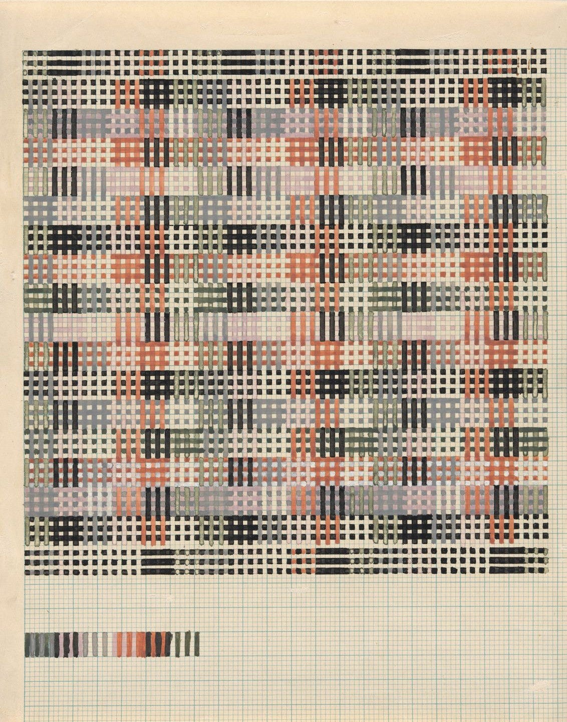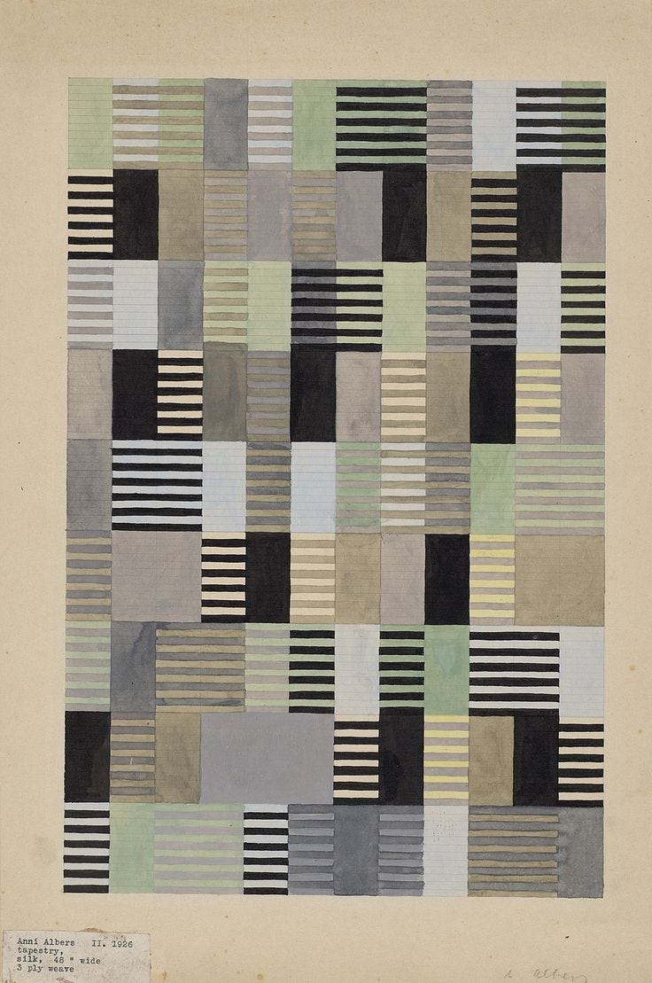 Weavers Gunta Stölzl and Anni Albers are top of mind examples of this way of working, as both utilized painted grids to inform their woven textiles. Stölzl and Albers studied at the Bauhaus, and Stölzl played an integral part in developing the weaving studio there. Stölzl mentored Albers for a time, and when she departed the Bauhaus in 1931, Albers took over the studio.