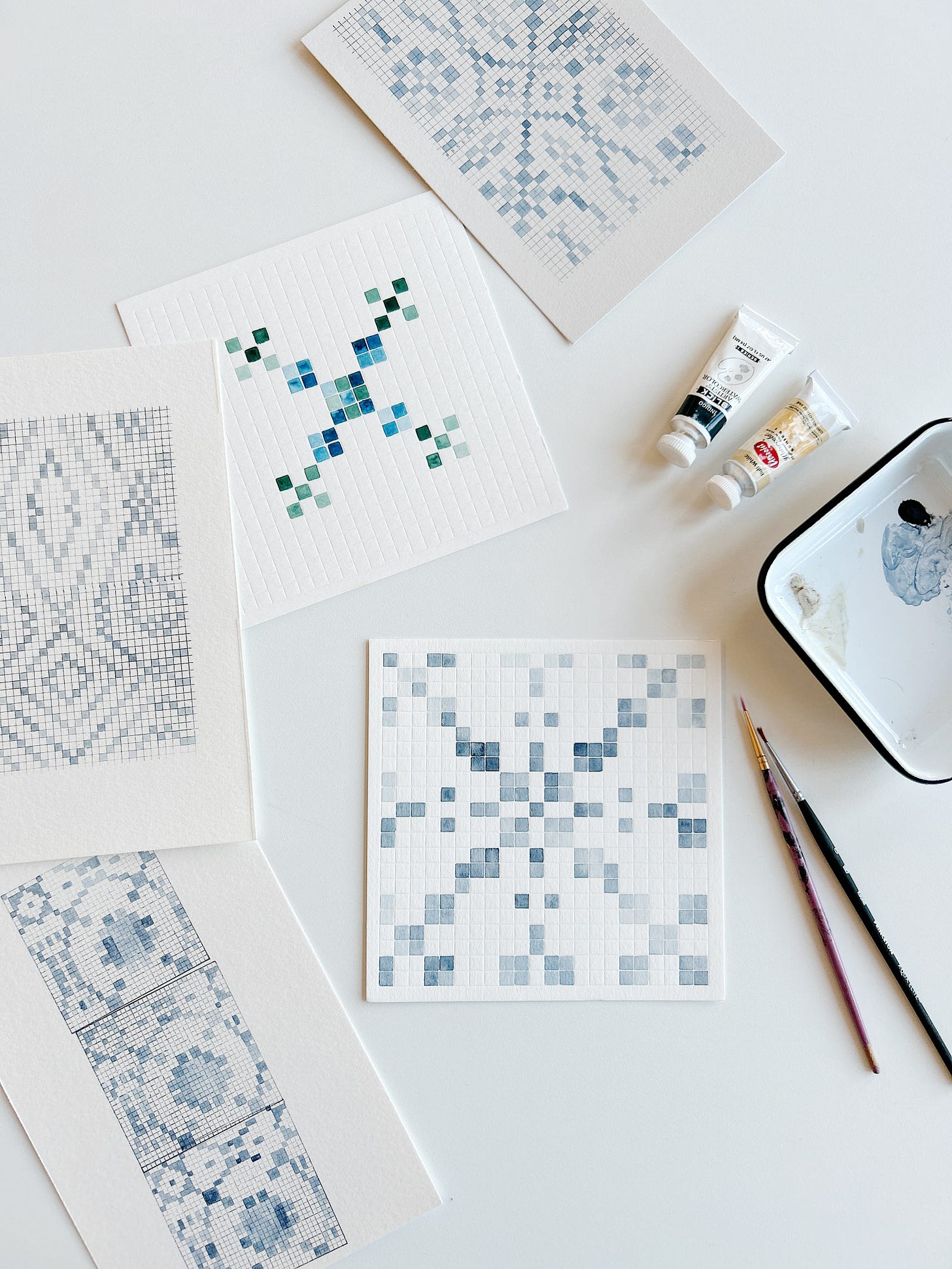 It was around this time that I started hunting for vintage grid stamps on ebay, as a quick way to create a grid on watercolor paper. These stamps are often small and I needed to stamp multiple grids next to each other in order to paint the design I envisioned. The stamped grids didn’t always line up or accidentally overlapped, a small detail I particularly loved. Similarly to my woven artworks, small imperfections or the ‘mark of the hand’ are celebrated.